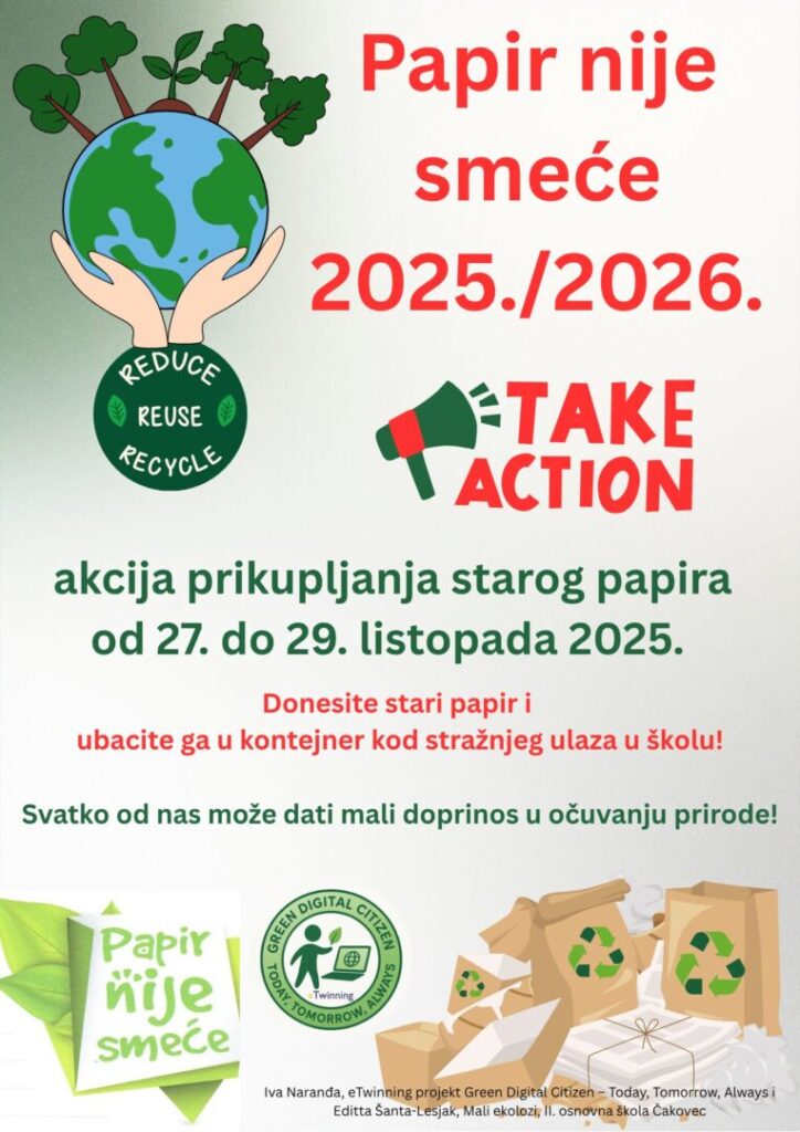 Osim sudjelovanja u akciji prikupljanja staroga papira na navedene datume, pozivamo vas da kontinuirano prikupljate papir i kartonsku ambalažu koju tijekom godine možete ubaciti u kontejner kod stražnjega ulaza u školu. Svatko od nas može dati mali doprinos u očuvanju prirode. Potaknimo učenike da postanu ekološki savjesne osobe, poučimo ih o važnosti zaštite okoliša, razvrstavanju otpada, sortiranju i ponovnom recikliranju. Razvijajmo održive navike naših učenika od najmlađe dobi!