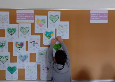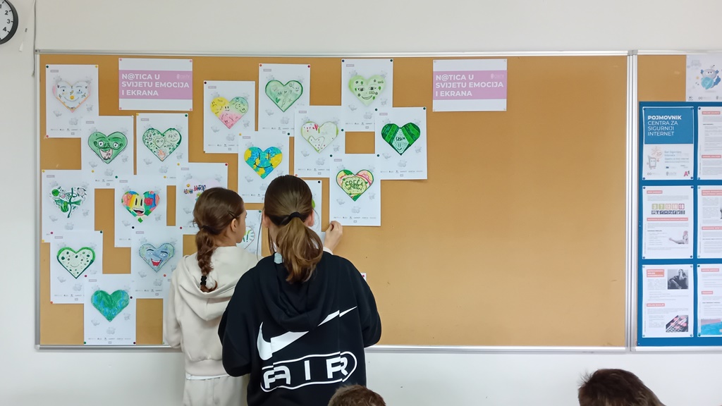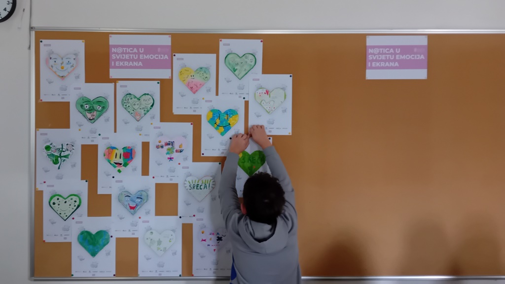 Prikladno je uređen pano u informatičkoj učionici. Na jednom dijelu panoa izloženi su savjeti za sigurno korištenje interneta, a na drugi dio su učenici četvrtoga razreda sami postavili svoje listiće nastale tijekom radionice N@tica u svijetu emocija i ekrana.