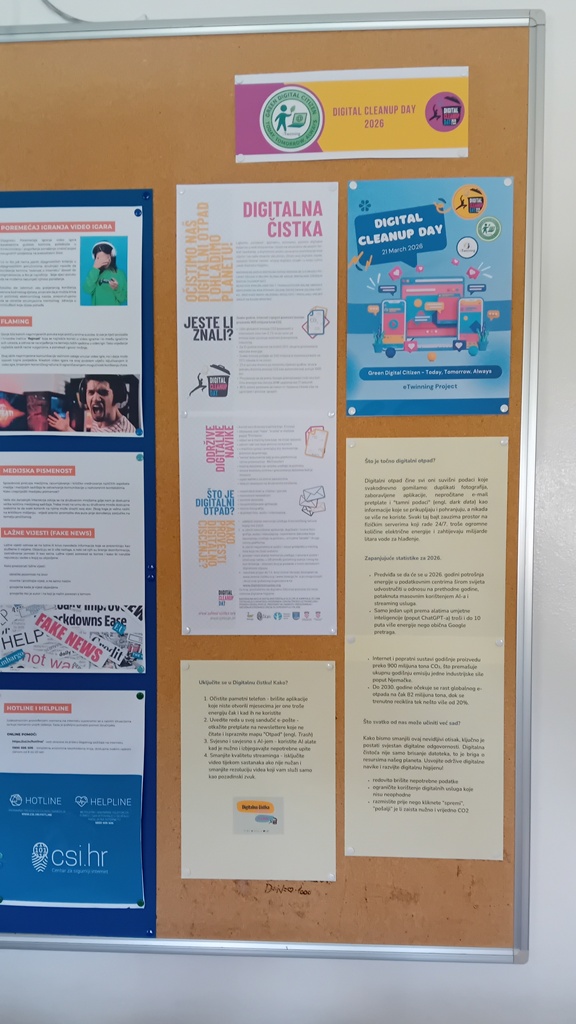 II. osnovna škola Čakovec i ove se godine pridružila akciji Digitalna čistka, koju koordinira Udruga Žmergona razini Hrvatske, 21. ožujka 2026. u okviru globalne kampanje Digital Cleanup Day. Digitalna čistka provela se na satima Informatike pod vodstvom učiteljice Ive Naranđe s učenicima sedmoga i osmoga razreda i pod vodstvom učiteljice Ree Guterman s učenicima 3. b razreda. Učenici sedmoga i osmoga razreda obrisali su nepotrebne podatke na školskim učeničkim laptopima i vlastitom OneDriveu te u svojim sandučićima elektroničke pošte na CARNetovom Mailu, dok su učenici trećega razreda očistili 3,56 GB memorije na školskim tabletima. Ukupno smo obrisali oko 40 GB podataka. Za učenike osmoga razreda sudjelovanje u ovoj akciji ujedno je dio aktivnosti u sklopu eTwinning projekta Green Digital Citizen – Today, Tomorrow, Always.