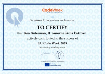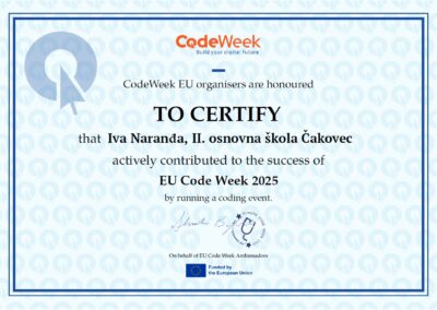 U II. osnovnoj školi Čakovec ove su se godine aktivnostima Europskog tjedna programiranja pridružile učiteljice Iva Naranđa, Ida Veselovac, Rea Guterman i Ana Koprek. Učenici su sudjelovali u raznolikim aktivnostima s ciljem da im se na zabavan i angažirajući način približi programiranje i digitalna pismenost. Europski tjedan programiranja ove se godine održavao od 11. do 26. listopada, a naša škola je na karti događanja prijavila dvadeset i četiri aktivnosti.