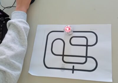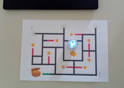 Učenici sedmoga razreda ponovili su osnove rada s Ozobotom, a zatim su sudjelovali u aktivnosti Ozobot Maze Game. Koristeći OzoBlockly, učenici su programirali Ozobot kako bi pronašli blago u jednom labirintu i natjecali se tko će prvi doći do blaga i tko će putem do blaga pokupiti najviše žetona.