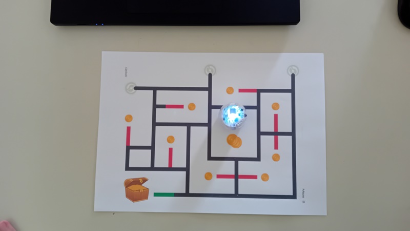 Učenici sedmoga razreda ponovili su osnove rada s Ozobotom, a zatim su sudjelovali u aktivnosti Ozobot Maze Game. Koristeći OzoBlockly, učenici su programirali Ozobot kako bi pronašli blago u jednom labirintu i natjecali se tko će prvi doći do blaga i tko će putem do blaga pokupiti najviše žetona.