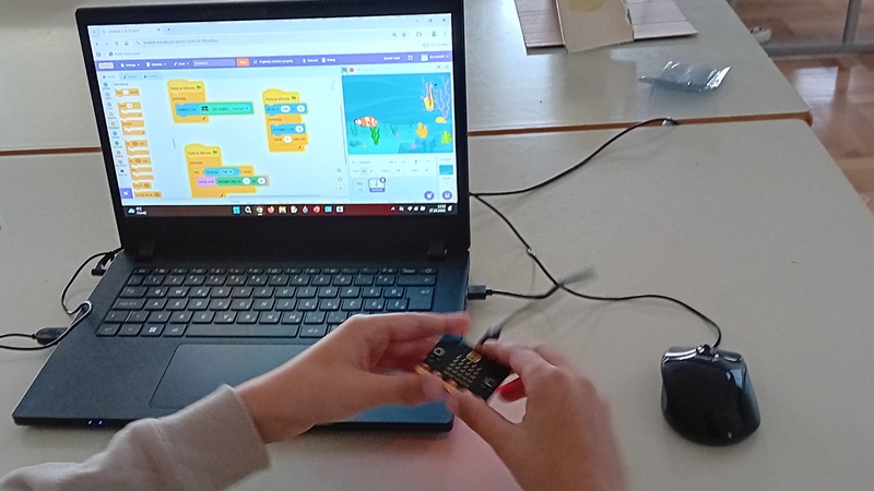 U drugoj aktivnosti polaznici INA Informatika+ koristili su Scratch i micro:bit kako bi povezali fizički svijet i programiranje. Učenici su uz pomoć uvodnih primjera kreirali Scratch projekte koji se povezuju s fizičkim svijetom, a zatim su izradili Scratch igru Ocean Adventure koja koristi micro:bit kao kontroler.