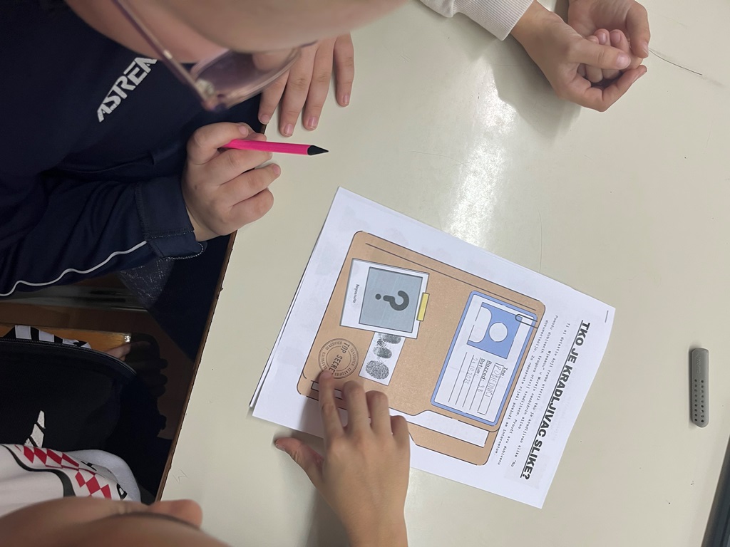 Aktivnost Tko je kradljivac umjetničkog djela nešto je drukčija. Nizom koraka učenici su rješavali slučaj krađe umjetničkog djela Na Mjesecu u Muzeju neobičnih slika. Nekoliko je sumnjivaca. Svaki ima svoju priču. Učenici su pozorno čitali detektivske bilješke, proučavali fotografije, opise sumnjivaca te specifikacije umjetničkoga djela ne bi li došli do rješenja. Radeći u skupinama, na zabavan su način otkrili pravoga krivca.