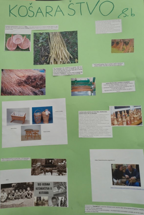 Sljedeća aktivnost bila je istraživanje tradicijskoga znanja o košaraštvu. To je umijeće pletenja šibom, a razvilo se u selima uz vodu (poput Kotoribe) jer su močvarna staništa idealna za uzgoj vrbe (šibe). Bez očuvanih vlažnih staništa nestala bi sirovina za ovu vještinu koja se koristi za izradu svega, od košara do kukuružnjaka. Učenici 8. b razreda i vjeroučiteljica Sandra Radiković prezentirali su svoje istraživanje o košaraštvu u Međimurju učenicima i djelatnicima naše škole.