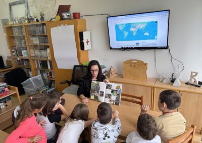 Naše putovanje nastavili smo u školskoj knjižnici gdje smo uz pomoć knjižničarke Nine Vugrinec istražili kako žive i što doručkuju naši vršnjaci diljem svijeta.