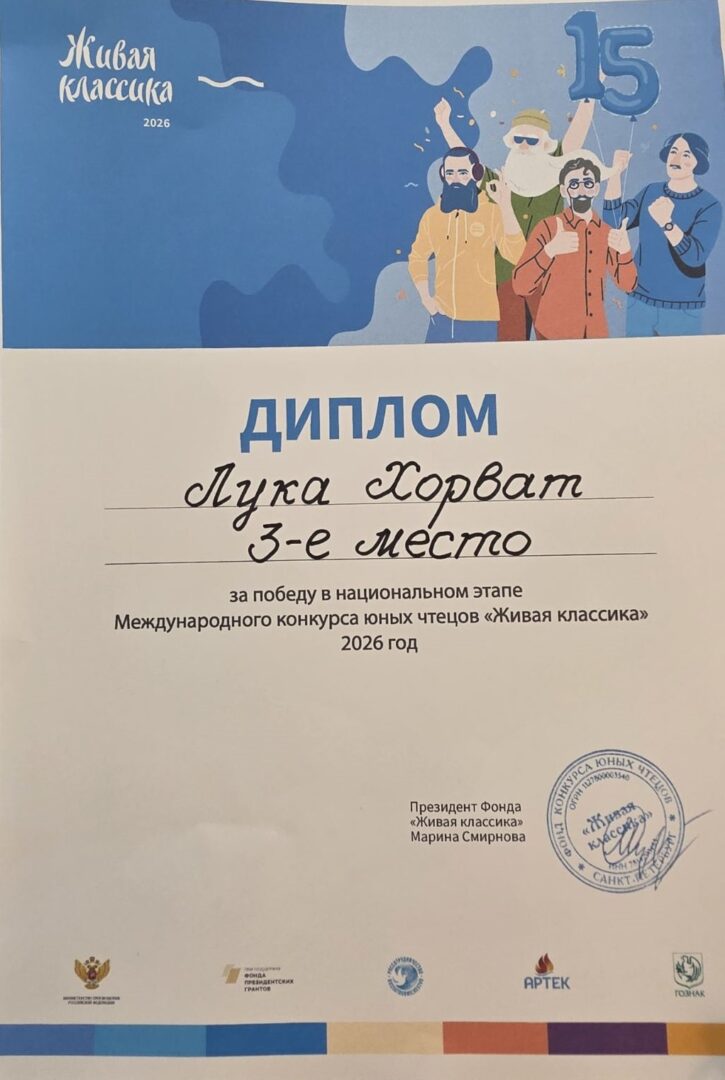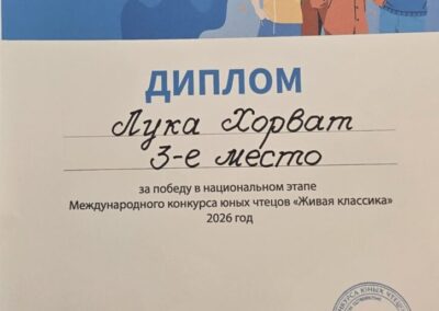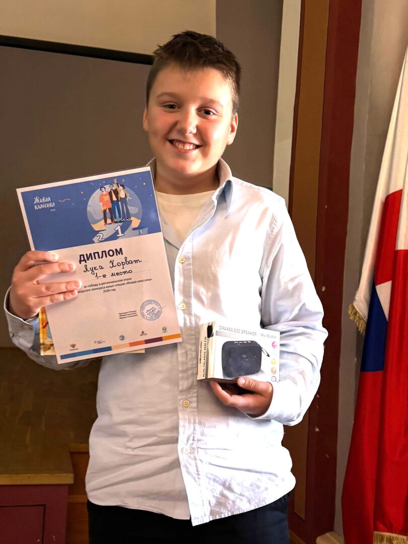 Luka, učenik 5. c razreda koji uči ruski jezik i kulturu po modelu C, ostvario je izniman uspjeh na ovogodišnjoj smotri „Živa klasika“. Nakon što je svojom sigurnošću, izražajnošću i izvrsnom interpretacijom osvojio 1. mjesto na 13. Regionalnoj smotri, plasirao se na državno natjecanje.