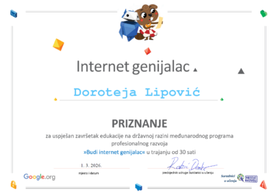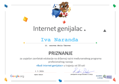 Svjesne toga da je odgovorno i primjereno korištenje tehnologija važna tema, tijekom veljače 2026. tri učiteljice II. osnovne škole Čakovec uključile su se u e-tečaj Budi internet genijalac koji je pripremila udruga Suradnici u učenju. E-tečaj se provodio na CARNET-ovoj platformi Loomen za stručna usavršavanja i sadržavao je brojne aktivnosti za kvalitetno i zanimljivo poučavanje ove teme. Aktivnosti su bile podijeljene u deset tema. Nakon završenog tečaja polaznici koji su uspješno završili tečaj dobili su potvrdu o završetku edukacije u trajanju od 30 sati. Prijaviti se moglo bez obzira na uzrast učenika s kojima se radi ili predmeta koji se predaje. Iz naše škole navedenu edukaciju uspješno su završile učiteljice Ida Veselovac, Doroteja Lipović i Iva Naranđa.