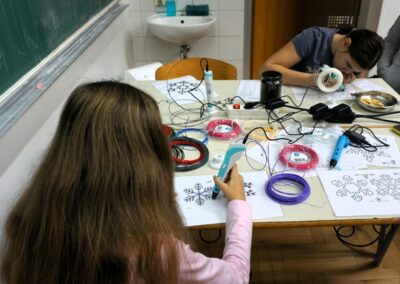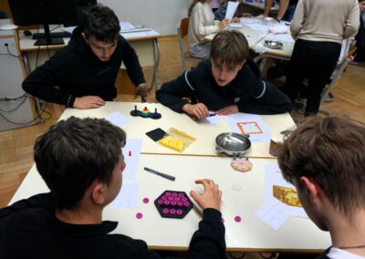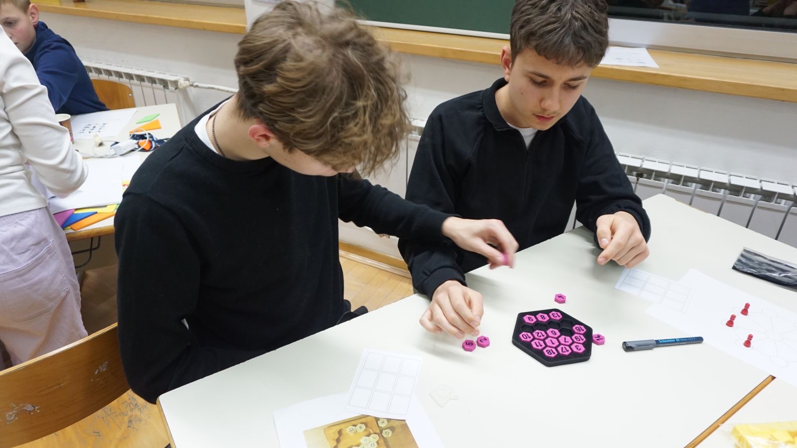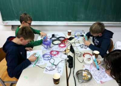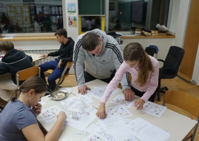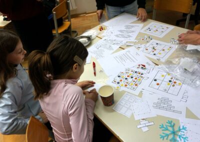 Nakon kviza učenici su se okušali u raznim igrama i mozgalicama, uključujući sudoku, igru asocijacija, Tangrama, te igre koje smo prošle školske godine ispisali na 3D pisaču: Shisimu, Hanoi toranj, Aristotelovu slagalicu 38 i mnoge druge. Na radionici 3D olovaka izrađivali smo snježne pahuljice i izložili ih u učionici Matematike. Posebno zabavna bila je igra procjene, tj. pogađanja količine zrna u staklenki, koja je izazvala puno smijeha i natjecateljskog duha među sudionicima.